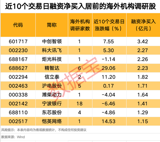 从资金面来看,近10个交易日超半数海外机构调研股获得融资客加仓宜人配资,其中10股获得融资净买入均超亿元。中创智领、科大讯飞、炬光科技、精智达等股的净买入额居前,中创智领累计获得3.42亿元净买入,居首。