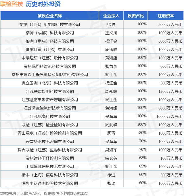本站消息,根据天眼查APP显示,联检科技(301115.SZ)新增一起对外投资事件,被投资公司为江苏国正检测有限公司,法定代表人徐淑彩,投资占比为2%。该公司从事专业技术服务业日升策略,注册资本为1020.4082万人民币。目前,联检科技共存在对外投资39项,投资占比前20的项目见下表: