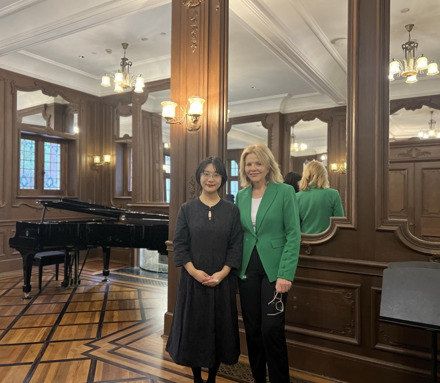 “我在德国留学时,哈特穆特·霍尔就是我的老师,他对亚洲文化有深厚感情,和他合作像和家人一样。”演出前一天,在上海音乐学院城市音乐会客厅一层西侧的百年镜厅,穿着鲜绿色西装外套的弗莱明接受文汇报记者专访时,谈及对上海观众的期待:“希望他们从演出中带走两份礼物——一份是音乐带来的快乐,一份是对自然的珍视。”身心疲惫时,她常靠在树林里散步获得慰藉。“音乐与自然的体验交织,会在大家心里留下长久的回响。”这份温暖与力量,恰是她想通过歌声传递的,而返场时史先生等观众的回应,生动印证了这份“回响”。